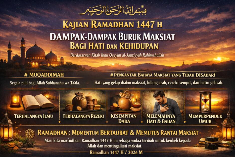 Kajian ini disusun sebagai pengingat tentang bahaya kemaksiatan terhadap hati dan kehidupan manusia, sebagaimana dijelaskan oleh para ulama. Dosa bukan sekadar pelanggaran syariat, tetapi juga memiliki dampak luas terhadap ketenangan jiwa, keberkahan hidup, serta kualitas hubungan seorang hamba dengan Tuhannya. Bulan Ramadhan menjadi momentum terbaik untuk melakukan introspeksi dan memperbaiki diri.