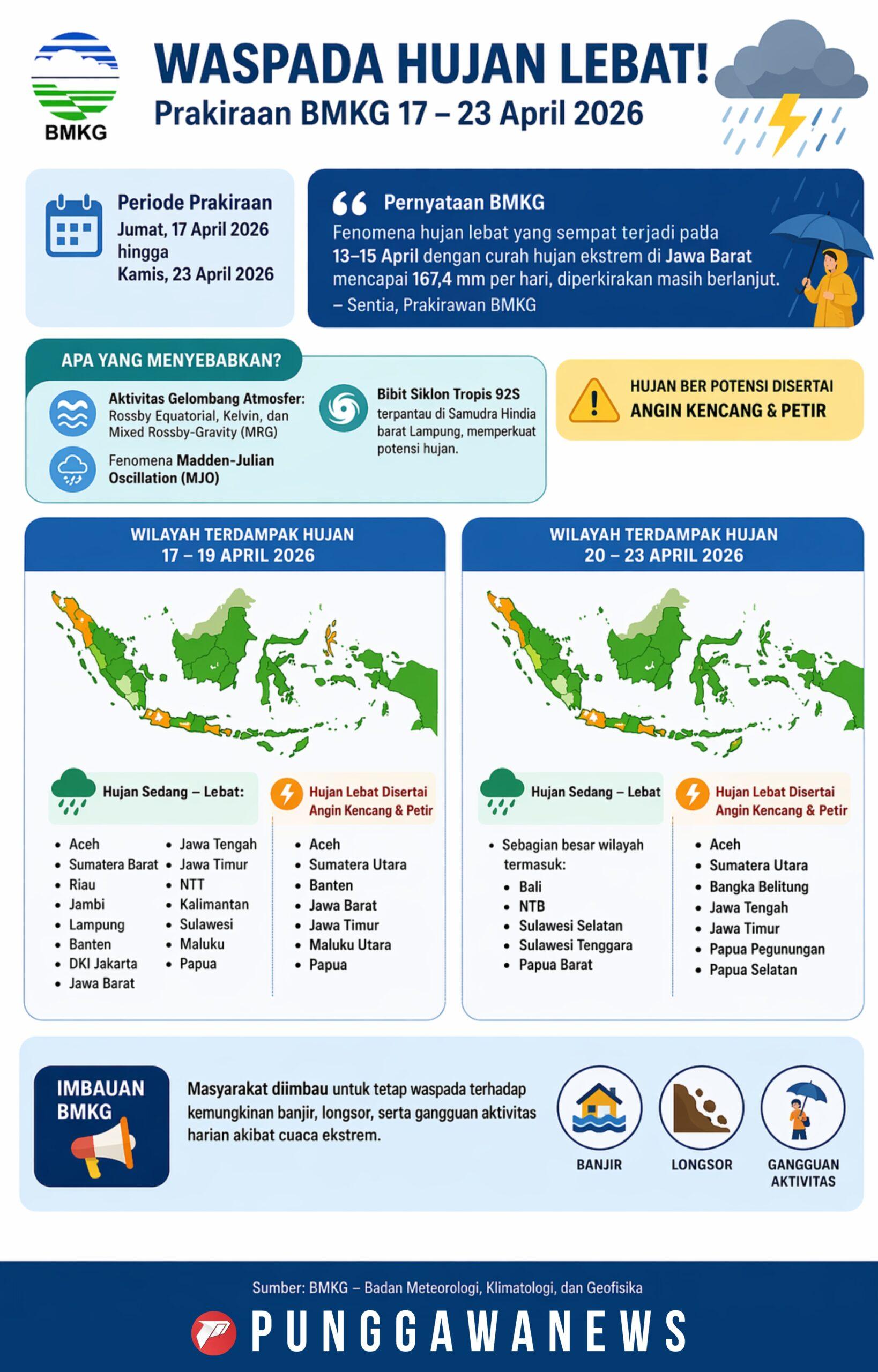 JAKARTA, PUNGGAWANEWS – Badan Meteorologi, Klimatologi, dan Geofisika (BMKG) memprakirakan potensi hujan masih tinggi di berbagai wilayah Indonesia sepanjang 17–23 April 2026. Fenomena hujan lebat yang sebelumnya terjadi dengan intensitas ekstrem diprediksi berlanjut, dipicu dinamika atmosfer dan aktivitas bibit siklon. Sejumlah daerah berpotensi mengalami hujan sedang hingga lebat disertai angin kencang dan petir. Kondisi ini meningkatkan risiko bencana hidrometeorologi seperti banjir dan longsor, sehingga masyarakat diimbau meningkatkan kewaspadaan serta kesiapsiagaan menghadapi cuaca ekstrem.