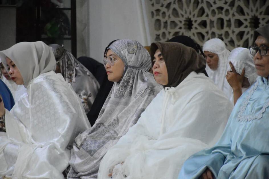 Bupati Ratnawati Arif tampak khusyuk melaksanakan shalat Subuh bersama ratusan jamaah yang memadati masjid sejak subuh. Kehadirannya mendapat sambutan antusias dari para pengurus masjid, tokoh masyarakat, tokoh agama, serta jamaah yang sebagian besar merupakan warga setempat.