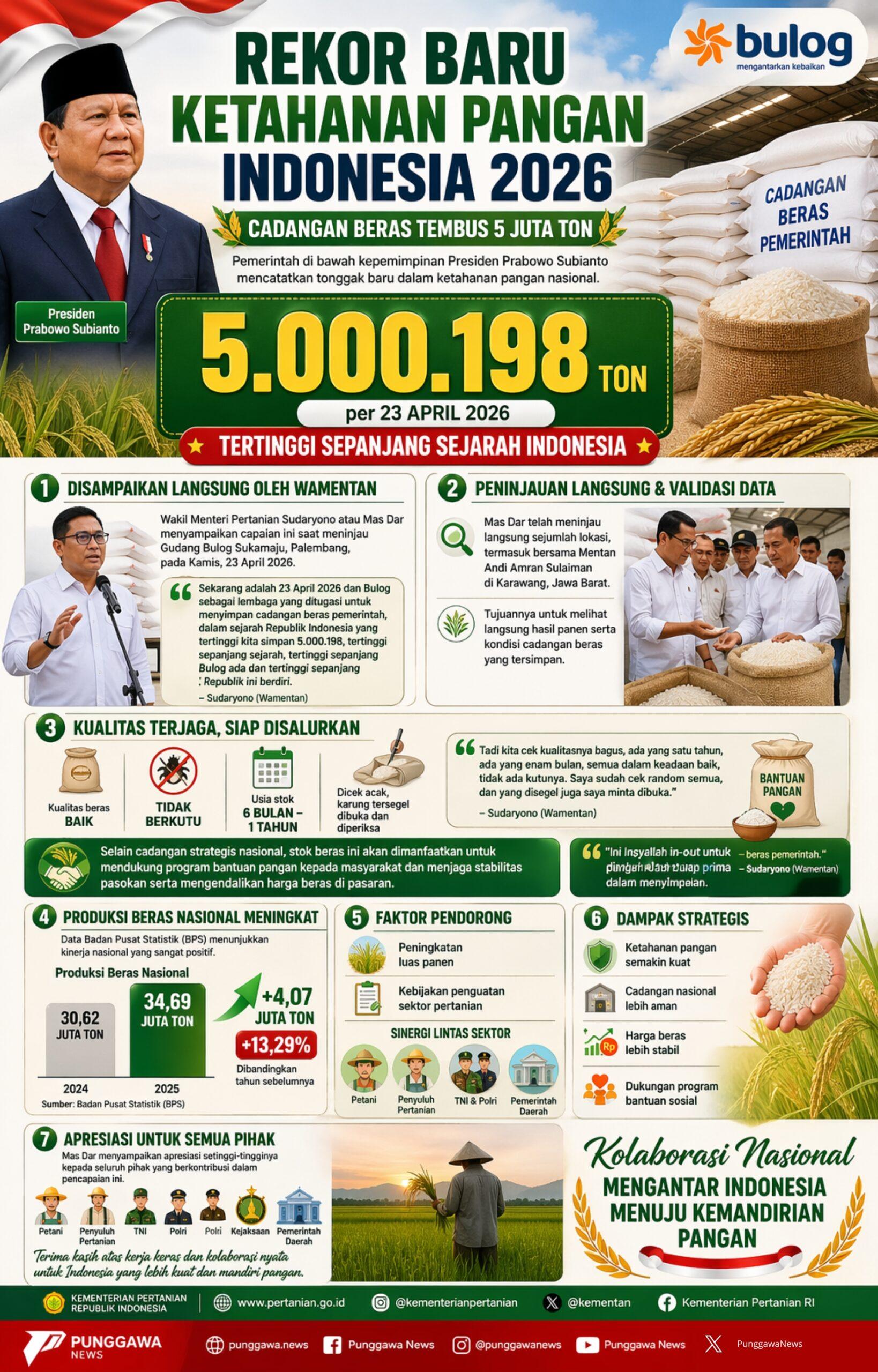 PUNGGAWANEWS – Indonesia mencetak tonggak baru ketahanan pangan pada 23 April 2026, saat cadangan beras Perum Bulog menembus 5.000.198 ton—tertinggi sepanjang sejarah. Wakil Menteri Pertanian Sudaryono menyebut capaian ini sebagai bukti keberhasilan kebijakan pangan era Prabowo Subianto. Pemerintah memastikan kualitas beras tetap prima melalui inspeksi langsung. Lonjakan stok ditopang produksi nasional yang meningkat signifikan pada 2025. Cadangan ini akan digunakan untuk bantuan pangan dan menjaga stabilitas harga di pasar.