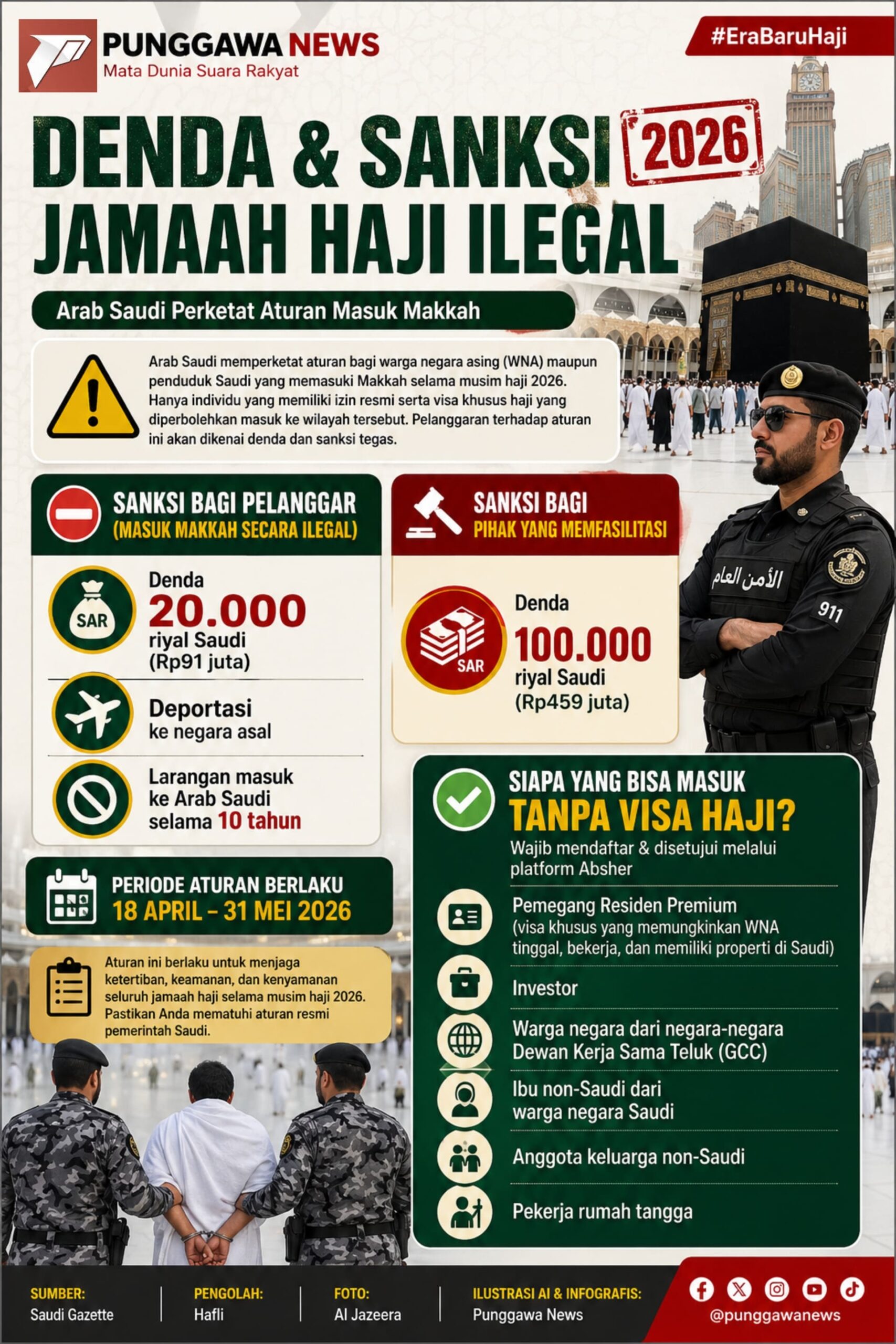 PUNGGAWANEWS – Infografik ini menyajikan informasi penting terkait kebijakan terbaru Arab Saudi dalam penyelenggaraan ibadah haji 2026. Pengetatan aturan diberlakukan guna menjaga ketertiban, keamanan, dan kenyamanan seluruh jamaah di Makkah. Hanya mereka yang memiliki izin resmi dan visa haji yang diperbolehkan masuk, sementara pelanggaran akan dikenai denda dan sanksi tegas. Selain itu, dijelaskan pula kategori pihak yang tetap dapat mengakses Makkah tanpa visa haji dengan persyaratan tertentu. Diharapkan informasi ini dapat menjadi panduan bagi masyarakat agar mematuhi aturan dan menjalankan ibadah haji secara aman dan sah.