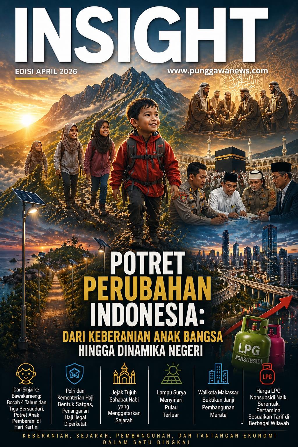PUNGGAWANEWS – Edisi April 2026 menghadirkan potret utuh dinamika Indonesia hari ini. Dari keberanian anak bangsa menapaki Bawakaraeng, langkah negara menata ibadah haji, jejak sejarah yang menginspirasi, hingga cahaya pembangunan di pulau terluar. Di tengah itu, tantangan ekonomi seperti kenaikan energi menjadi ujian bersama. INSIGHT merangkum harapan, kerja nyata, dan perubahan dalam satu bingkai Indonesia yang terus bergerak maju.