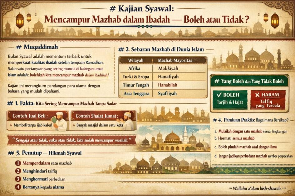 PUNGGAWANEWS, Bulan Syawal adalah momentum terbaik untuk memperkuat kualitas ibadah setelah tempaan Ramadhan. Salah satu pertanyaan yang sering muncul di kalangan umat Islam adalah: bolehkah kita mencampur mazhab dalam beribadah? Kajian ini merangkum pandangan para ulama dengan bahasa yang mudah dipahami.
