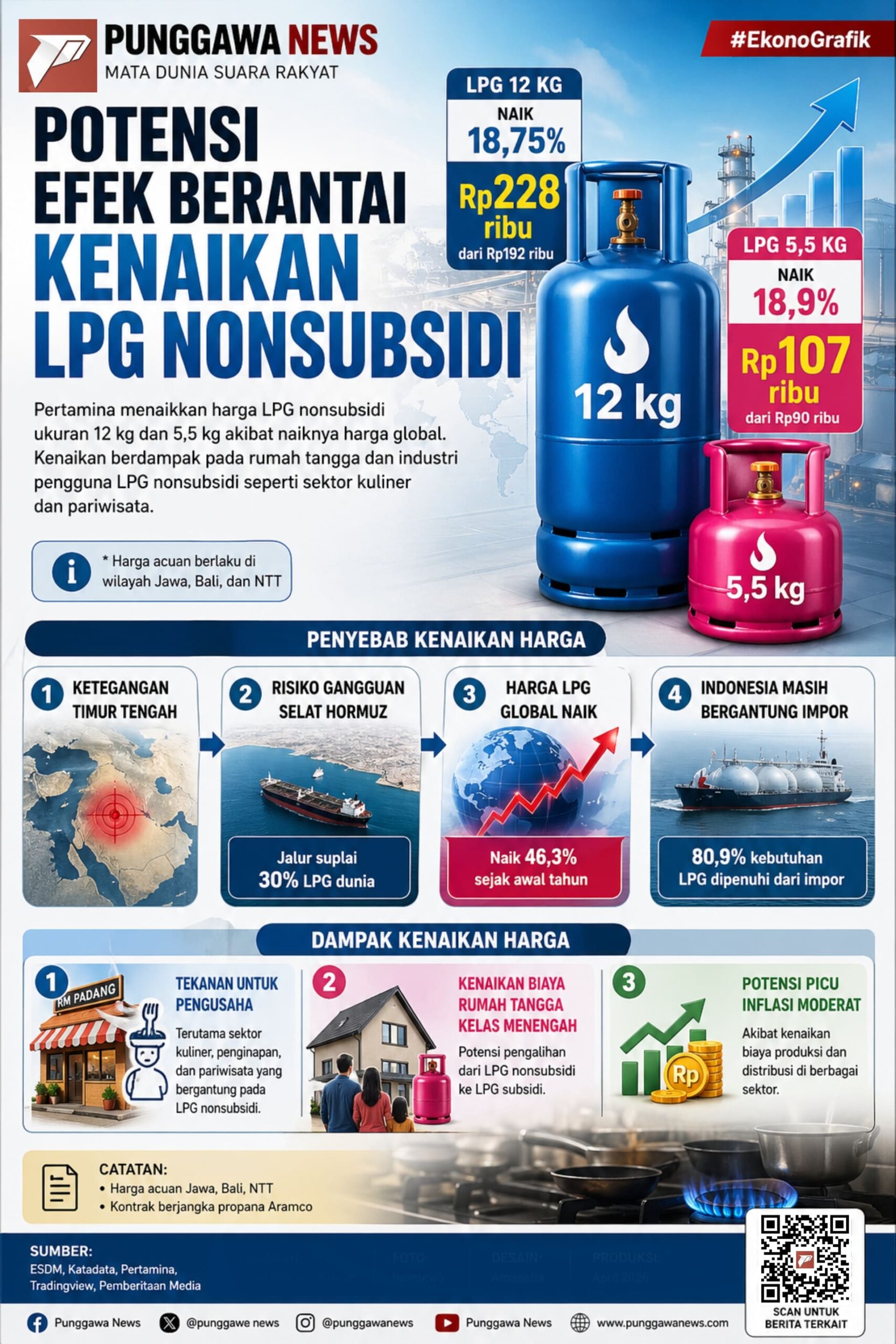 PUNGGAWANEWS – Kenaikan harga LPG nonsubsidi pada 2026 menjadi sorotan karena berdampak luas pada kehidupan masyarakat dan dunia usaha. Lonjakan ini dipicu oleh faktor global, termasuk gangguan pasokan energi dan ketergantungan impor Indonesia yang masih tinggi. Dampaknya tidak hanya dirasakan pelaku usaha seperti sektor kuliner dan pariwisata, tetapi juga rumah tangga kelas menengah. Infografik ini merangkum penyebab utama, besaran kenaikan, serta potensi efek berantai yang dapat memicu tekanan biaya hingga risiko inflasi.