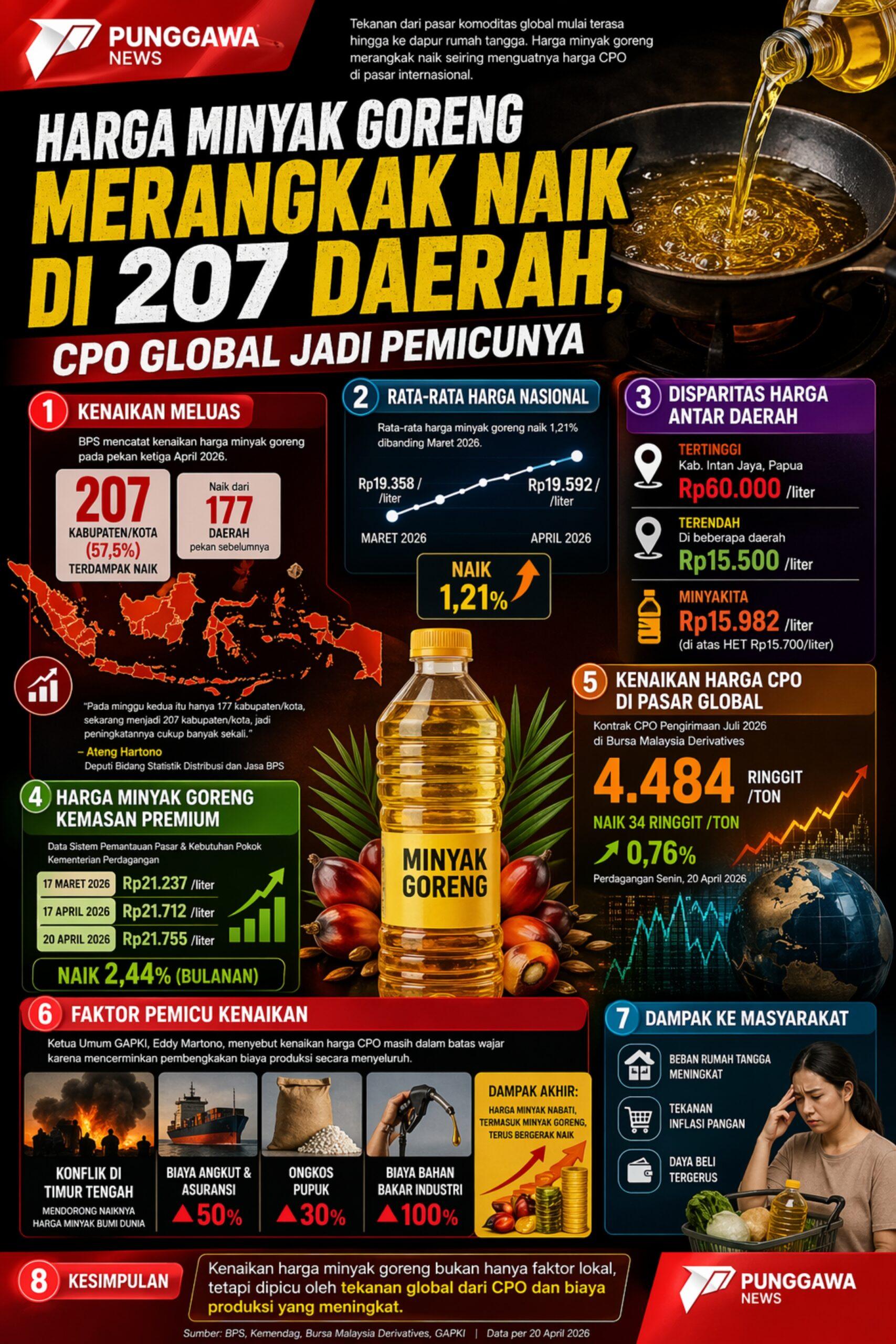 JAKARTA, PUNGGAWANEWS – Harga minyak goreng naik di 207 kabupaten/kota atau 57,5 persen wilayah Indonesia pada pekan ketiga April 2026, meningkat dari 177 daerah sepekan sebelumnya. BPS mencatat rata-rata harga nasional naik 1,21 persen menjadi Rp19.592 per liter, sementara Minyakita melampaui HET di angka Rp15.982 per liter. Lonjakan dipicu menguatnya harga CPO global, yang turut didorong konflik Timur Tengah. Ketua GAPKI menyebut biaya produksi sawit membengkak signifikan, mulai dari angkutan, pupuk, hingga bahan bakar industri, sehingga kenaikan harga dinilai masih dalam batas wajar.