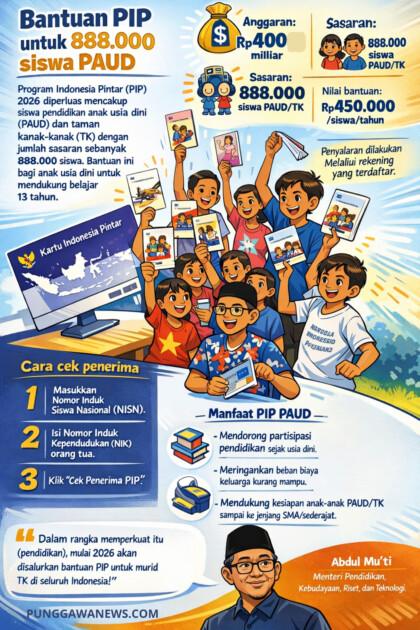 PUNGGAWANEWS, JAKARTA – Pemerintah melalui Kementerian Pendidikan Dasar dan Menengah (Kemendikdasmen) resmi memperluas cakupan Program Indonesia Pintar (PIP) pada tahun 2026 dengan menyasar peserta didik pendidikan anak usia dini (PAUD) dan taman kanak-kanak (TK). Sebanyak 888.000 siswa PAUD/TK di seluruh Indonesia akan menerima bantuan pendidikan sebagai bagian dari dukungan program wajib belajar 13 tahun.