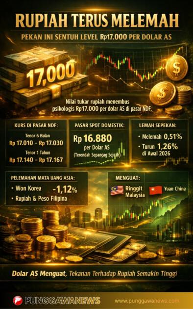 PUNGGAWANEWS, INFOGRAFIK — Nilai tukar rupiah terus menunjukkan tren pelemahan terhadap dolar Amerika Serikat sepanjang pekan ini. Bahkan, rupiah tercatat menembus level psikologis Rp17.000 per dolar AS di pasar Non Deliverable Forward (NDF), mencerminkan tekanan yang masih kuat terhadap mata uang domestik.