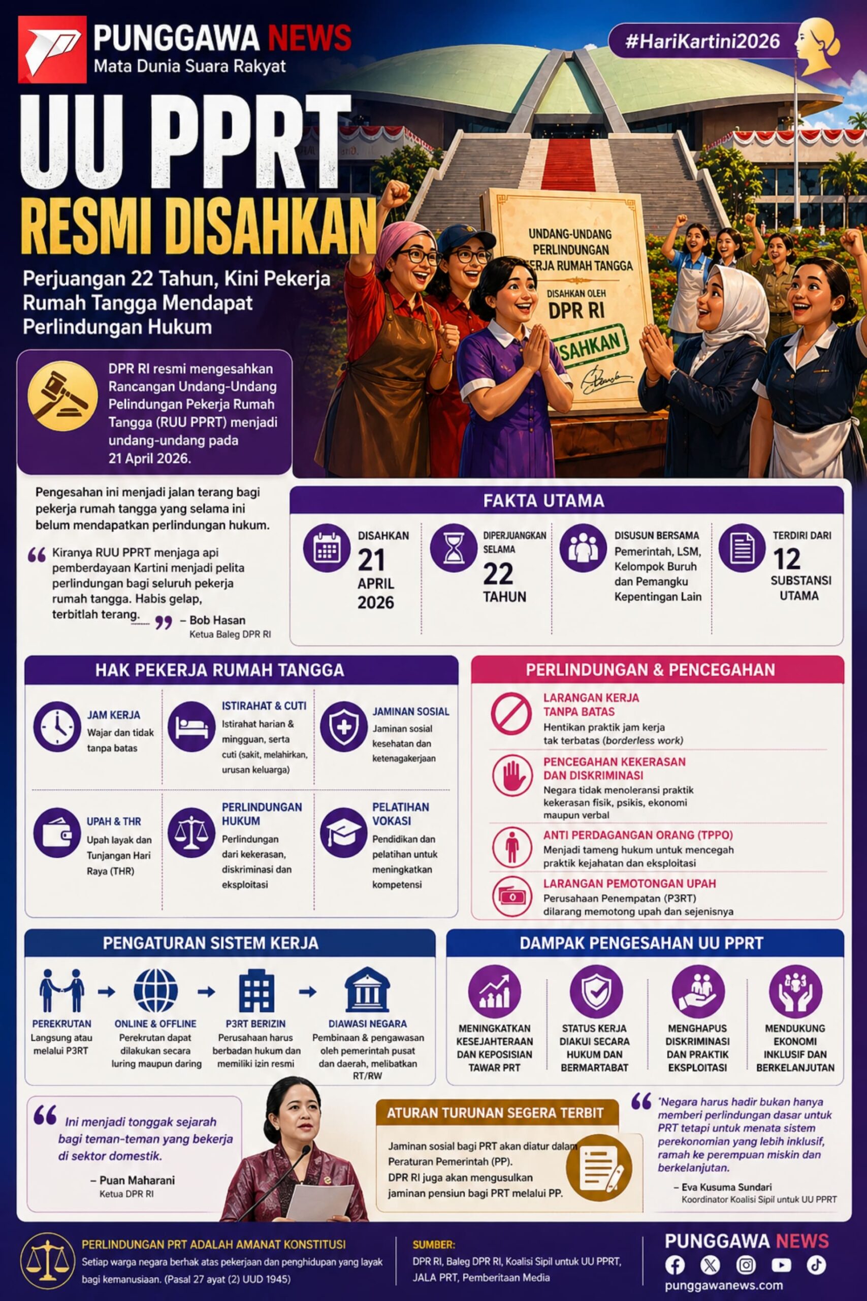 PUNGGAWANEWS, DPR RI resmi mengesahkan RUU Pelindungan Pekerja Rumah Tangga (PPRT) menjadi undang-undang pada 21 April 2026. Setelah lebih dari dua dekade diperjuangkan, regulasi ini menjadi tonggak penting dalam memberikan kepastian hukum bagi pekerja rumah tangga yang selama ini berada di sektor informal. UU ini menegaskan hak-hak dasar, perlindungan dari eksploitasi, serta pengakuan status kerja yang lebih layak, sekaligus menjadi langkah menuju sistem ketenagakerjaan yang lebih adil dan inklusif di Indonesia.